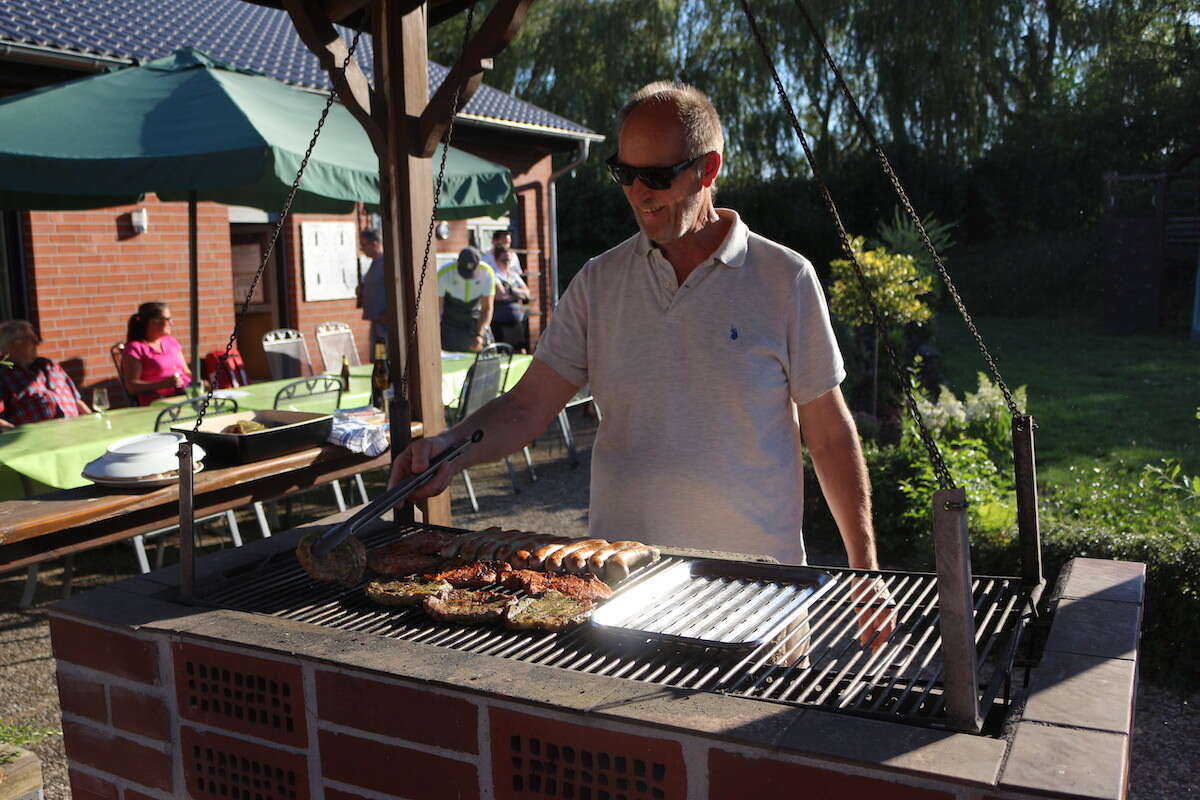 Am Ende der aktiven Phase des Tages wurden unter den Teilnehmenden noch attraktive Preise verlost. Über die beiden Hauptgewinne in Form von Gutscheinen der Bäckerei Balkenholl und der Festsäle Fricke freuten sich Andreas Türschmann (Glückspilz des Tages!) und Jörg Schwieger. Zum Ausklang des Tages bereitete Markus Prilopp Leckeres auf dem Grill zu, dass sich die Mitglieder und willkommenen Gäste mit Salaten vom Buffet besonders gut schmecken ließen.