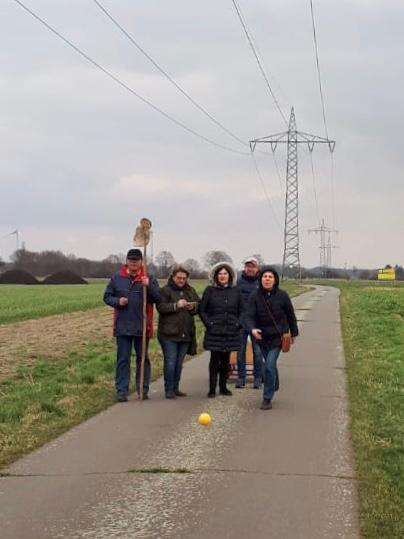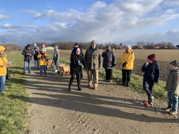 Die Zusammensetzung der Teams wurde zu Beginn ausgelost, bevor die knapp 20 Teilnehmenden vom Tennisheim bei Sonnenschein zum Streckenbeginn in Richtung Röhrse aufbrachen. Mit dem Ziel vor Augen, nämlich die bunten Kugeln mit möglichst wenigen Würfen über die Strecke zu bringen, stärkten sich zunächst alle Boßelspieler aus dem gut gefüllten Bollerwagen. Die Organisatorin Sabine Adler gab dann für das erste Team "Yellow Submarine" den Startwurf frei. Es folgte das Kinder-Team "rote Teufel" sowie die Teams "Blue Sky" und "Return". Die Spielerinnen und Spieler warfen die Kugeln mit unterschiedlichen Techniken geschickt entlang der Straße, damit sie möglichst weit rollten. Nachdem die Hälfte der Strecke zurückgelegt war, gab es eine Pause mit kleinem Imbiss und warmen Getränken. Die Sonne blieb uns leider nicht über die ganze Spielzeit erhalten, Wolken zogen auf und auch im Schneegestöber wurde eifrig weiter gebosselt.