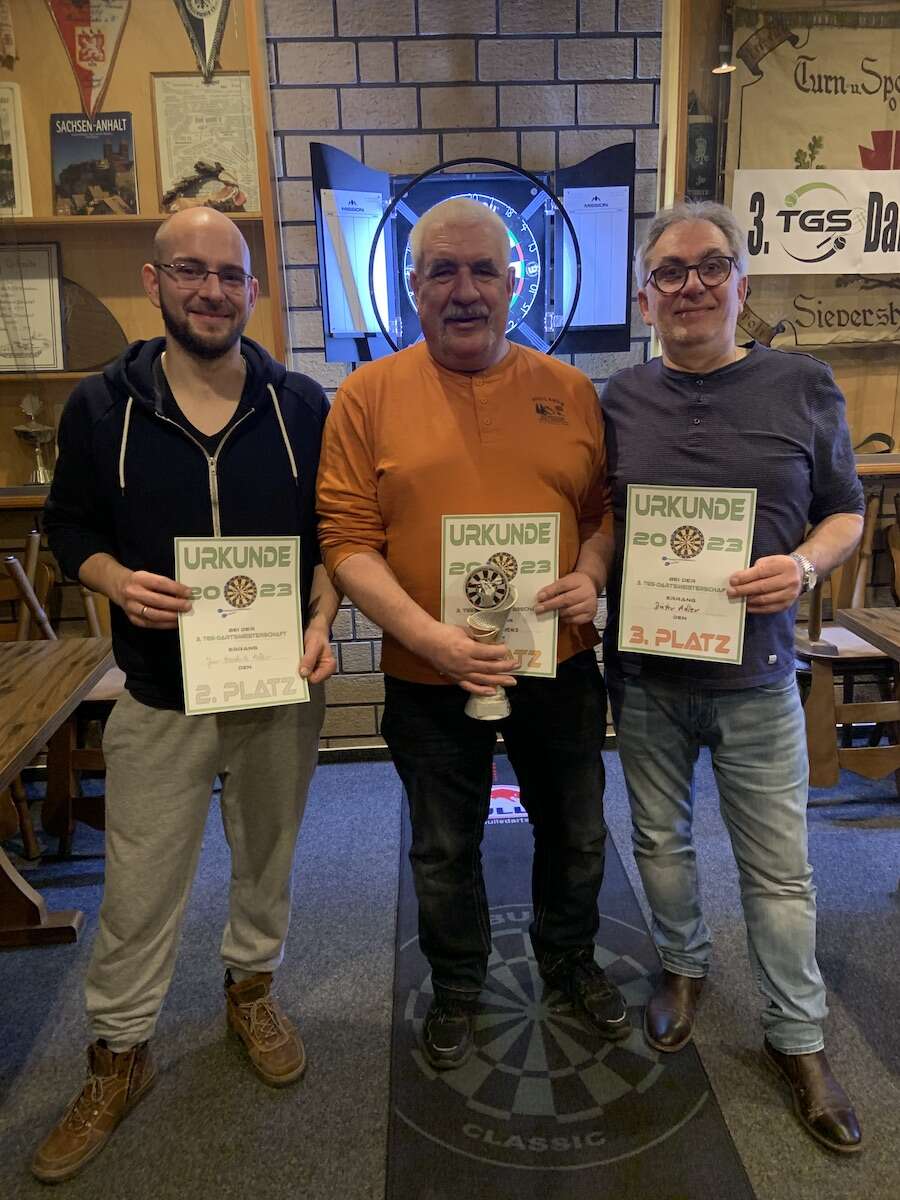 Es war schon erstaunlich, wie zielsicher teilweise die selbst mitgebrachten Steeldarts geworfen wurden. Besonders auffällig war bei Titelverteidiger Walter, dass er gefühlt ein Dutzend Mal den Mittelpunkt der Dartscheibe entweder mit „Single Bull“ oder „Bull`s Eye“ traf. Doch das half ihm am Ende nicht, um als Sieger erneut gekürt zu werden. Als bester Spieler des Abends nahm in diesem Jahr Harry Adler die Siegerurkunde und den Wanderpokal entgegen. Mit einem hervorragenden Wurf des letzten Pfeiles über das Feld Doppel 18 siegte er über den Überraschungsspieler Sven Heise mit zwei Legs im Finale. Das Spiel um Platz 3 bestritten Markus Prilopp und Andreas Türschmann, der ebenfalls einen super Treffer mit seinem letzten Steeldart in das Feld Doppel 15 landete und mit einem erleichterten Freudenschrei die Dartmatte verließ. Unter dem Beifall aller Anwesenden wurde den Siegern gratuliert und sie freuten sich über ihre Urkunden und Preise wie eine Flasche Sekt und Wunsch-Gutscheine im Wert von 15 € und 25 €.