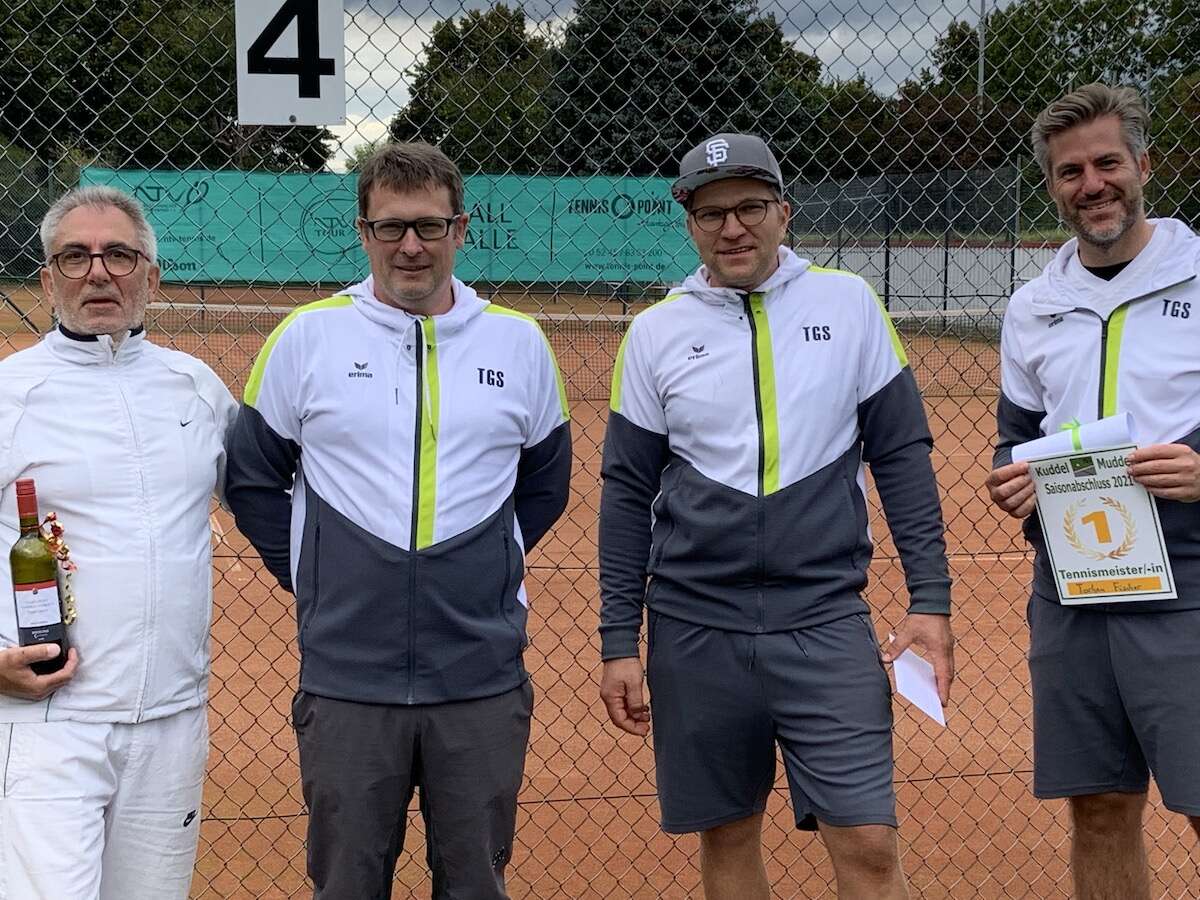 Ein Dutzend Aktive der TGS freuten sich auf ihre letzte Meisterschaft der diesjährigen Spielsaison, die wie in jedem Jahr als beliebtes Kuddelmuddel-Turnier ausgetragen wurde. Unser Sportwart Sebastian Neuner hatte sich genau überlegt, wie der Turniertag für alle Tennisbegeisterte attraktiv gestaltet werden könnte. Unter großer Zustimmung schickte er die Spielerinnen und Spieler mit dem Auftrag auf die Plätze, nicht auf Zeit, sondern mit jeweils zwei Aufschlagspielen pro Kopf möglichst viele Siege für die jeweilige geloste Doppelpaarung einzufangen. Mit dieser Spielregel sollte auch der ein oder andere Neuling profitieren. Es wurde gekämpft, gehofft, verloren und ganz viel gejubelt. Am Ende landete ausschließlich die männliche Konkurrenz auf den ersten drei Plätzen. Mit insgesamt 31 gewonnenen Spielen freute sich der Newcomer des Jahres 2021 Thorben Fischer über seinen verdienten Sieg. Mit seiner ruhigen und besonnenen Spielweise konnte er seine Gegner am Ende bezwingen und sich den Titel als Kuddelmuddelmeister 2021 erkämpfen. Zuvor war er im Siegerteam der Mixed-Meisterschaft und als Spieler mit den meisten Forderungsspielen am Start. "Das Training und die Spielpraxis haben sich in diesem Jahr anscheinend gelohnt", resümierte Thorben seine erfolgreiche Spielzeit. Mit jeweils 20 gewonnenen Spielen gingen Maria Belén Gigena und Christina Schwieger als beste weibliche Spielerinnen hervor.